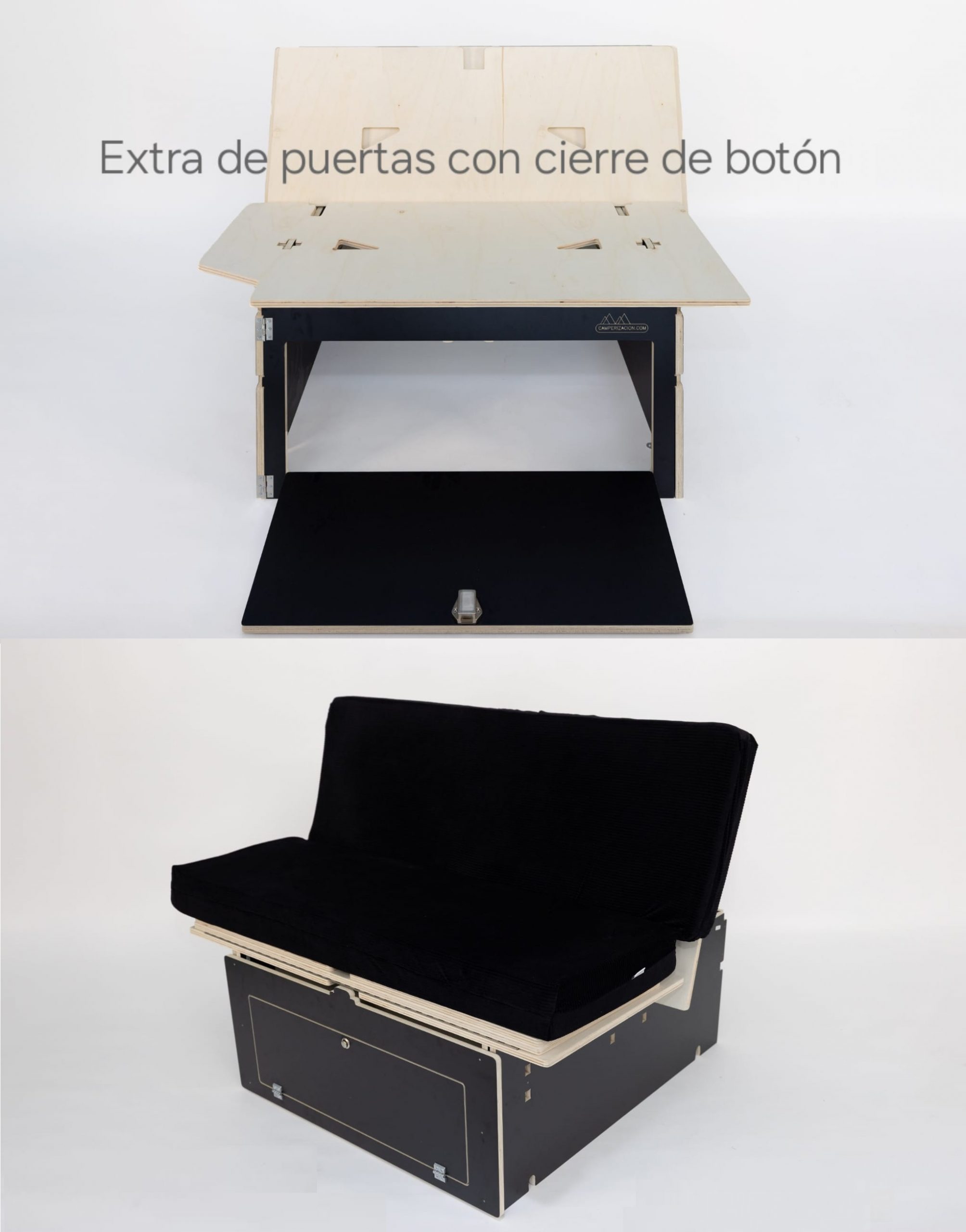 Descubre la versatilidad del nuevo sofá-cama con apertura longitudinal para Camper! Este kit está diseñado inicialmente para las Volkswagen T5 y T6, ¡pero no te preocupes si tienes otra versión de furgoneta mediana! ¡Nosotros podemos adaptarlo para ti si nos contactas y nos indicas tu modelo de furgo!.